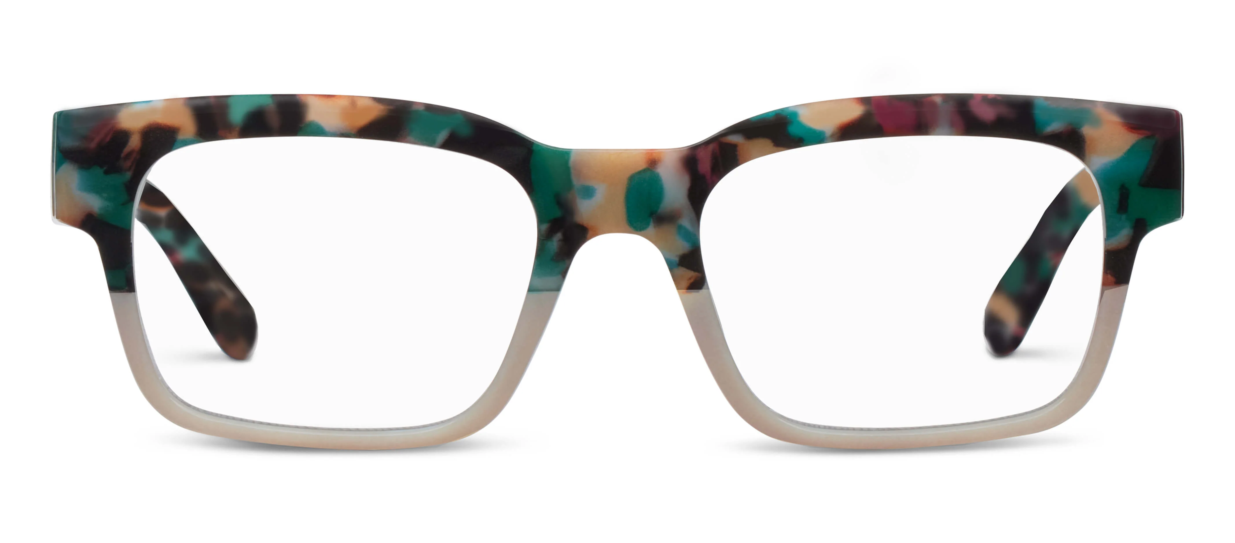 Transport your look to the next level with daring Denver. Creative color blocking of botanical camo patterns is paired with a classic square shape. This statement style is entertainment for your soul...sure to become a headlining head-turner.